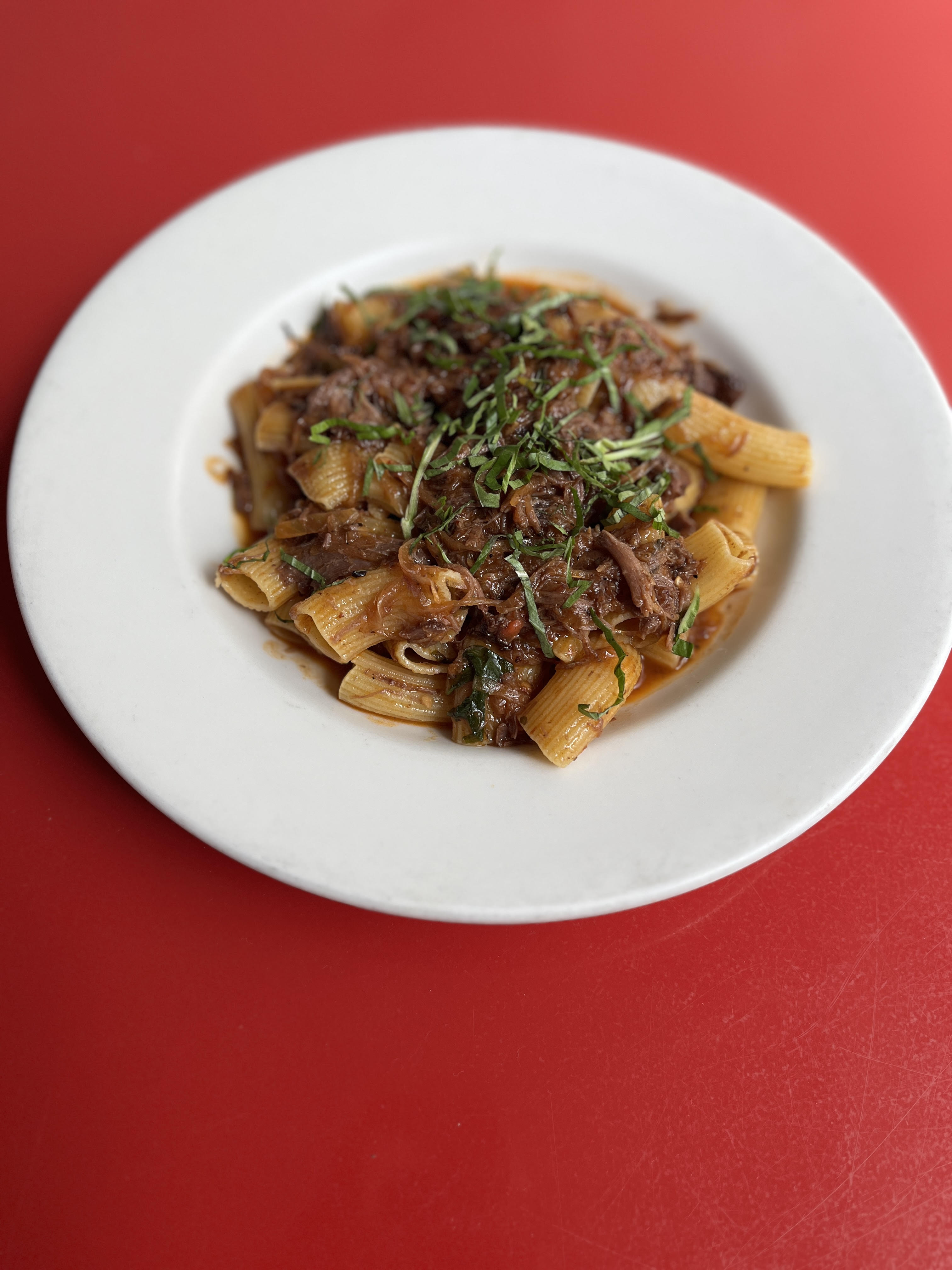 Fresh made rigatoni pasta tossed in a lamb ragu made with ground lamb, carrot, onion, celery, tomato, wine and herbs. It’s amazing!